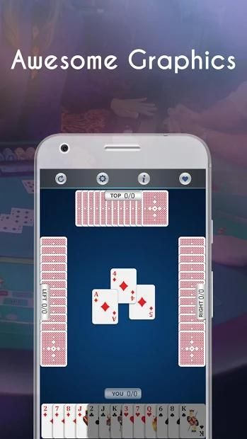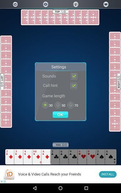 Call bridge offline card game free is a addictive and popular card game of tricks, trumps and bidding which is popular in Bangladesh. Call bridge seems to be related to the North American game Spades.This game - Call bridge is played using a standard international 52-card pack. The cards of each suit rank from high to low A-K-Q-J-10-9-8-7-6-5-4-3-2. Spades are permanent trumps: any card of the Spade suit beats any card of any other suit.Deal and play are counter-clockwise.To succeed in Call bridge, a player must win the number of tricks called, or more trick than the call. If a player succeeds, the number called is added to his or her cumulative score. Otherwise the number called is subtracted.