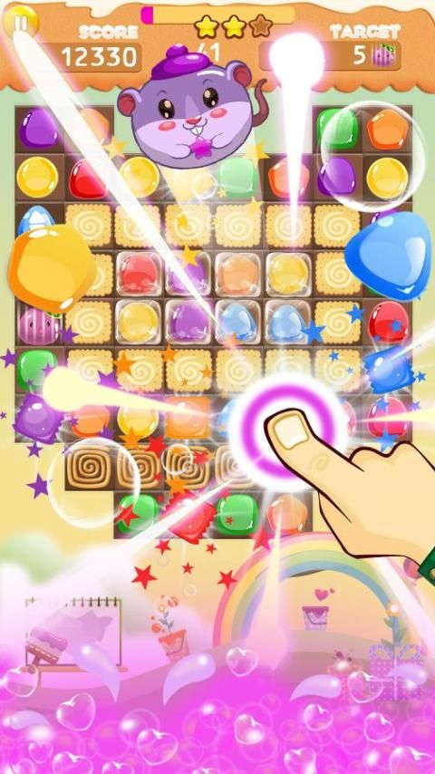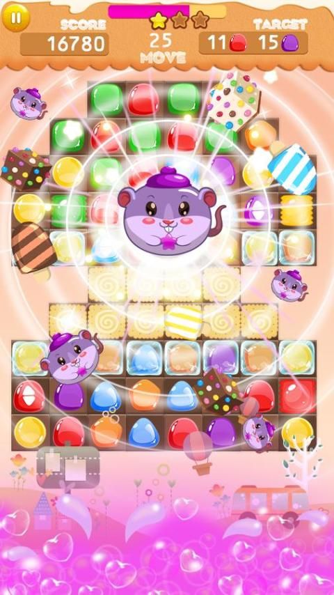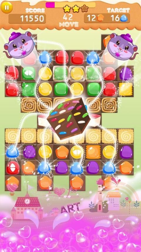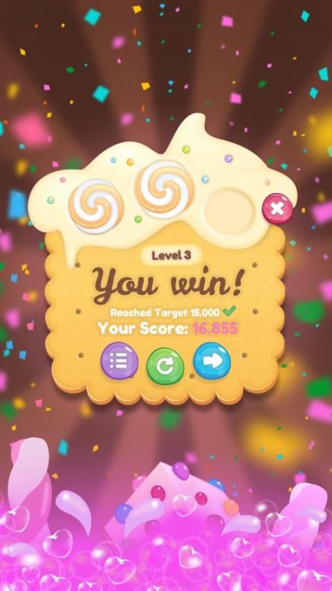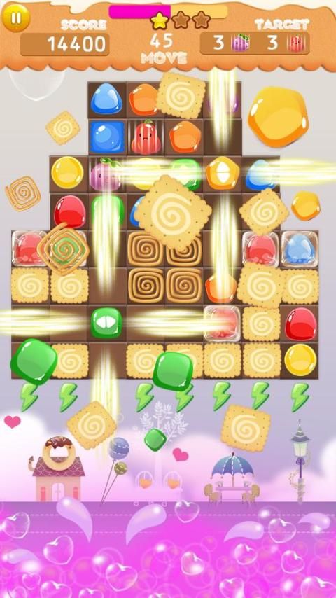 - Sasaran Score: Hancurkan Permen untuk mencapai skor yang diperlukan dan mendapatkan 3 bintang. Permen Ledakan harus sesuai dengan warna permen yang sama.