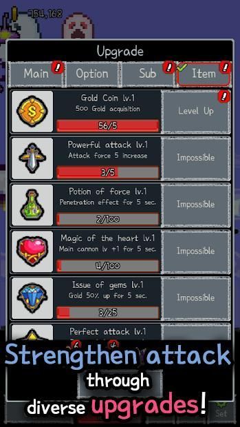 Monsters leave option cannon when they die. Option cannon are provided in the upgrade menu, option cannon category. Same option cannons can be integrated to level up to a stronger option cannon. As the level increases, attack power is increased and with some luck, you can have some special abilities. Actively use the option cannon’s strength.
