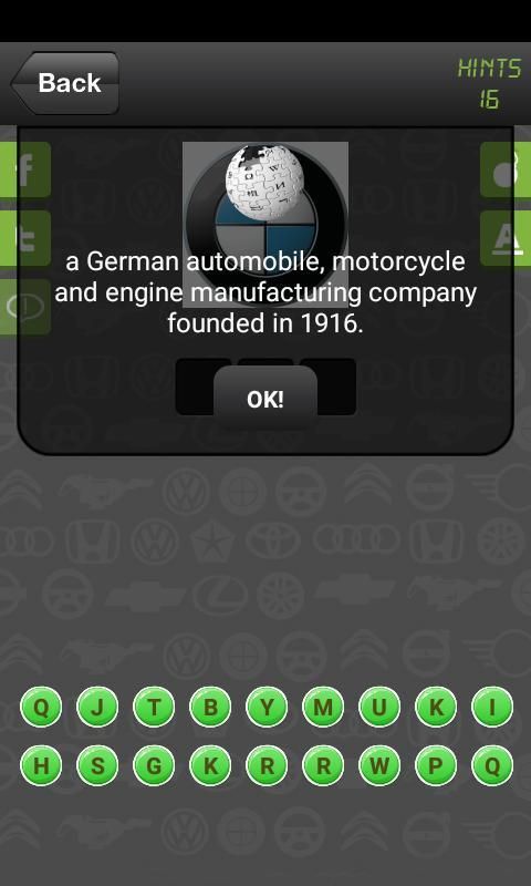 Jika Anda terjebak dan tidak tahu jawaban, jangan khawatir! Anda selalu dapat meminta teman-teman Anda di twitter atau facebook dan menyelesaikan hilang Car Logos kuis!