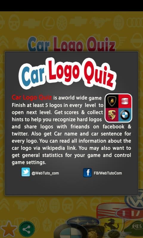 Mobil Logo Quiz adalah permainan menghibur di mana Anda menebak Logo mobil. Maju melalui tingkat kesulitan dan berusaha untuk skor tertinggi. Semakin Car Logo Quiz Anda menebak lebih xp Anda akan mendapatkan. Jika Anda terjebak dan tidak tahu jawaban, jangan menyerah! menggunakan xp Anda berkumpul untuk mendapatkan petunjuk untuk Mobil nama Logo atau menghapus huruf yang tidak perlu. Jika Anda masih terjebak mencoba meminta teman-teman Anda di Twitter atau Facebook.