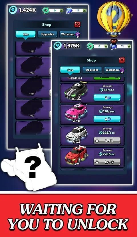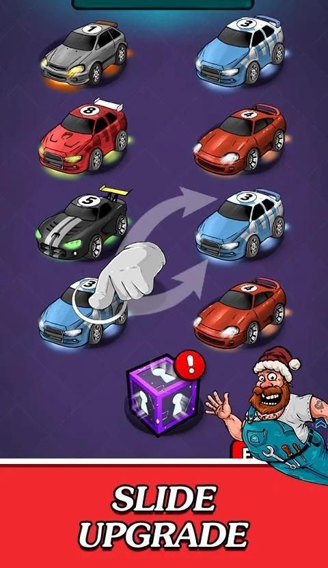 Gabungkan mobil-mobil dengan level yang sama di jalan, buka mobil-mobil level tinggi, dan jatuhkan kotak hadiah misterius.