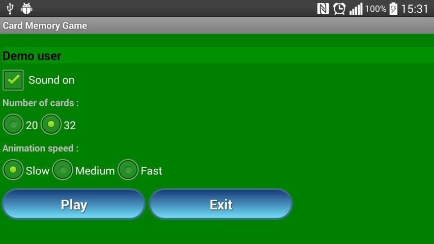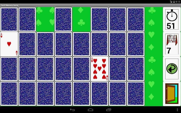 Card Memory Game is a card game in which cards are laid face down on a table and two cards are flipped face up on each turn. The object of the game is to turn over pairs of matching cards. The game is also known as Memory or Pairs. In our version of the game player can use decks of 20 or 32 playing cards. Cards are laid face down in four rows of five or eight cards each. In each turn player chooses two cards and turns them face up. If they are of the same rank and color (ace of hearts and ace of diamonds, king of clubs and king of spades, …) player wins the pair and cards are removed from the table. The game ends when the last pair is picked up. Time is recorded and added to leaderboard.