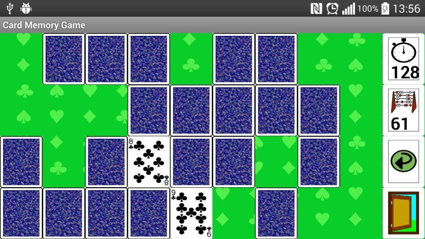 Kartu Memory Game adalah permainan kartu di mana kartu diletakkan menghadap ke bawah di atas meja dan dua kartu membalik menghadap ke atas pada setiap giliran. Tujuan dari permainan ini adalah untuk menyerahkan pasangan kartu yang cocok. Permainan ini juga dikenal sebagai Memory atau Pasangan. Dalam versi kita tentang game player dapat menggunakan deck 20 atau 32 kartu remi. Kartu diletakkan menghadap ke bawah dalam empat baris dari lima atau delapan kartu masing-masing. Di tiap giliran pemain memilih dua kartu dan ternyata mereka menghadap ke atas. Jika mereka dengan nilai yang sama dan warna (as hati dan ace berlian, raja klub dan raja sekop, ...) pemain memenangkan pasangan dan kartu dikeluarkan dari meja. Permainan berakhir ketika pasangan terakhir diangkat. Waktu dicatat dan ditambahkan ke leaderboard.