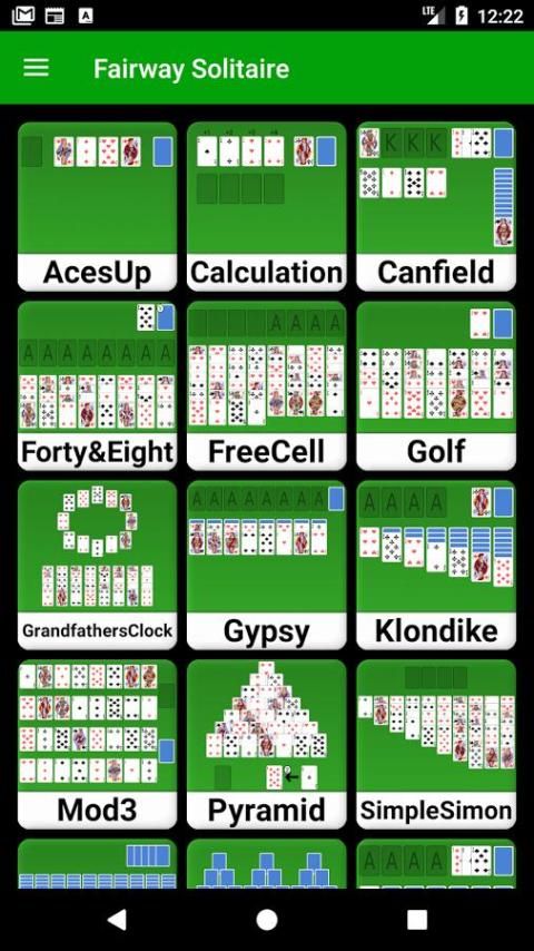 Saat ini Anda dapat bermain AcesUp, Canfield, Empat puluh & Delapan, FreeCell, Golf, Kakek Jam, Gypsy, Klondike, mod3, Pyramid, SimpleSimon, Spider, Tripeaks, Vegas dan Yukon. Jika Anda ingin saya untuk menambahkan lebih banyak game, tolong katakan padaku.