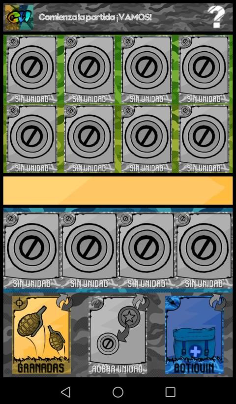 * SENJATA: Mereka terdiri dari surat-surat GRANADAS, LANZACOHETES, TORPEDOS, MISSILE dan MULTICOLOR ARM. Dengan kartu-kartu ini, Anda dapat melemahkan kondisi unit saingan dengan melemparkannya. GRANADAS akan memengaruhi unit BATALLÓN dan MULTICOLOR. LANZACOHETES akan memengaruhi unit TANK dan MULTICOLOR. TORPEDOS akan memengaruhi unit SUBMARINE dan MULTICOLOR. MISSILES akan memengaruhi unit HUNTING dan MULTICOLOR. GUN MULTICOLOR dapat mempengaruhi semua jenis unit. Ingatlah bahwa Anda tidak dapat melempar senjata ke unit saingan yang DIMUKSIM.