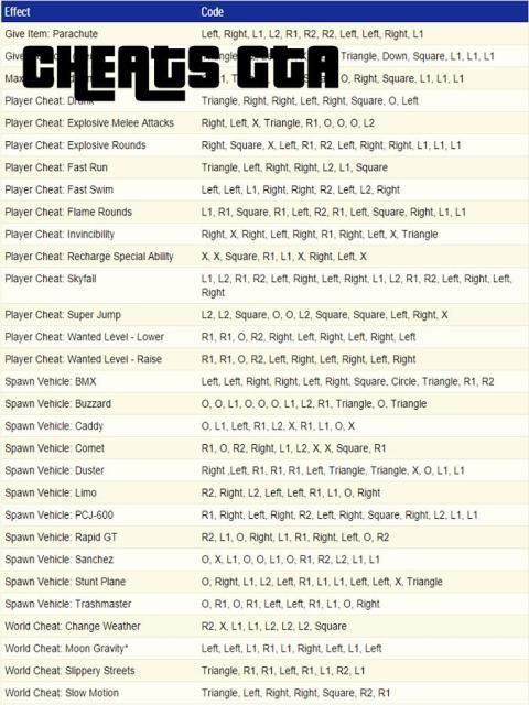 Aplikasi ini memiliki cheats untuk mengikuti platform untuk game Gta masing: