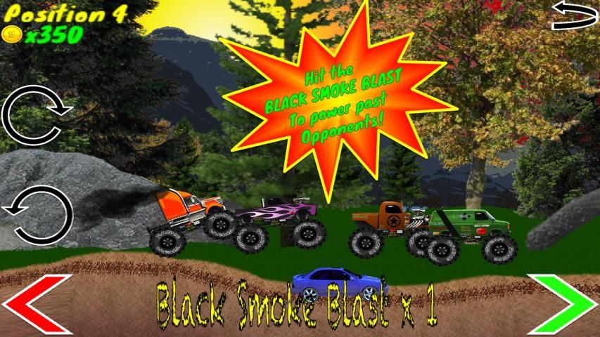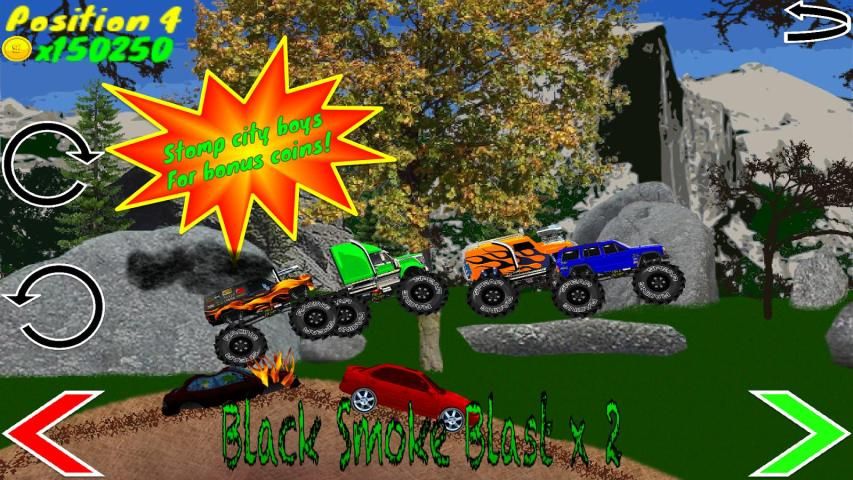 Berpacu dengan lainnya mendongkrak truk diesel dan menghancurkan anak-anak kota untuk koin bonus sepanjang jalan. Gunakan koin untuk membeli truk baru, upgrade kecepatan Anda, mengubah pekerjaan cat Anda, dan membeli tempat baru untuk balapan. Bust membalik karena Anda mendapatkan udara besar off melompat untuk mendapatkan beberapa koin gaya, tapi pastikan Anda mendarat di roda Anda atau Anda akan tidak lebih baik dari negara goreng-anak kota. Hit "HITAM ASAP BLAST" membanting pedal ke lantai dan mengirimkan awan asap hitam besar dari tumpukan asap Anda. Berbagi skor tinggi Anda sehingga anak-anak negara lain dapat melihat berapa banyak anak laki-laki kota Anda menginjak. Setiap tingkat 5 adalah "CITY BOY RAMPAGE" di mana Anda bisa menginjak-injak sejumlah konyol anak laki-laki kota. Menampilkan banyak lokasi balapan jalan negara kotoran, dan juga gletser di mana Anda harus keluar ban salju.