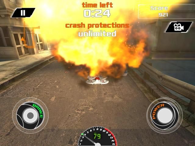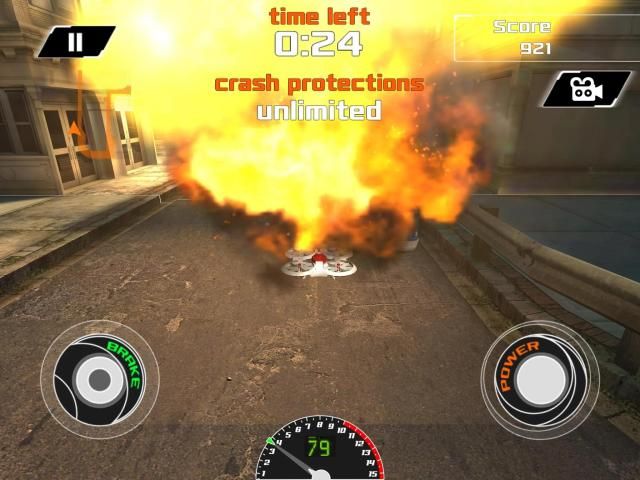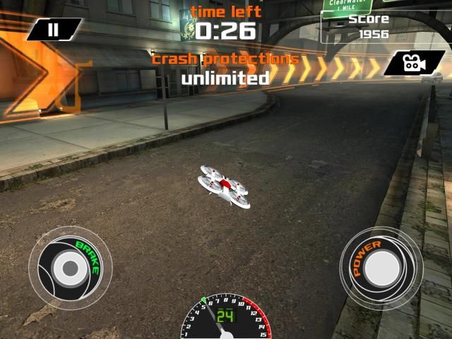 To play, simply select the drone you want to race, and then hit 'GO' and then the action starts as you fly all around a big city! Tap the 'POWER' button for a nitro boost type acceleration, and fly and then tap the 'BRAKE' button to slow down. You really need to be careful not to go too fast because there is a variety of oncoming traffic that is coming your way!