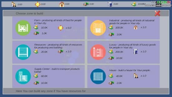 Build Your own city. You have to care about place to live for people and place to producing products for people. Careing about resources and money will help You grow super big city. When You fullfill whole fields, You can buy new one for earned money from people.