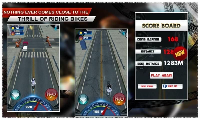 Rasakan sensasi balap tindakan tak terbantahkan di Kota Moto BikeRacer. Dalam permainan ini Anda bisa naik sepeda motor di dua lokasi yang berbeda satu di peta siang hari dan satu lainnya adalah adegan malam peta. berbagai jenis sepeda untuk memilih dari Hunter, Eagle, Racer, racerx, model sepeda. Travel jarak ke rekor