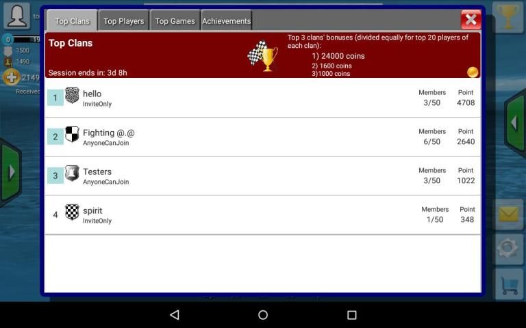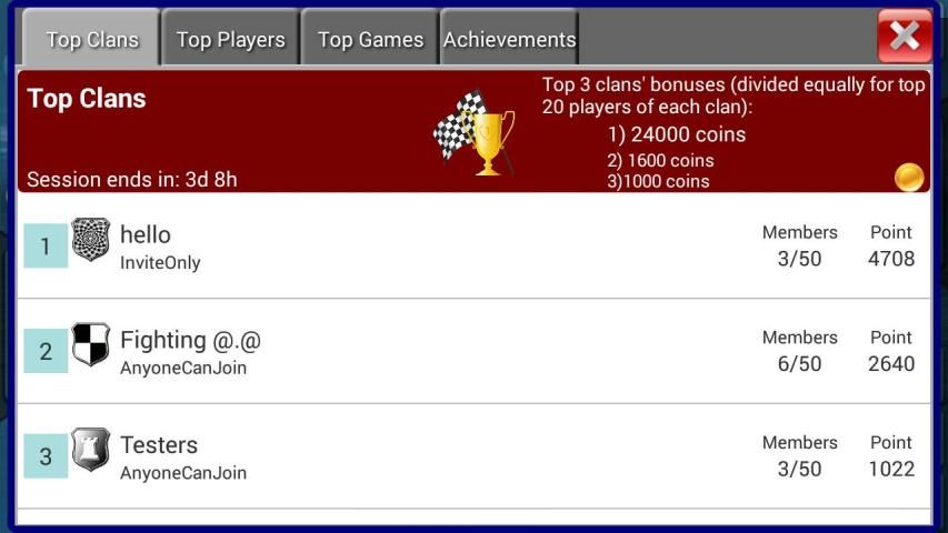 - Create clans, send mails, share games, receive and donate coins between clan friends