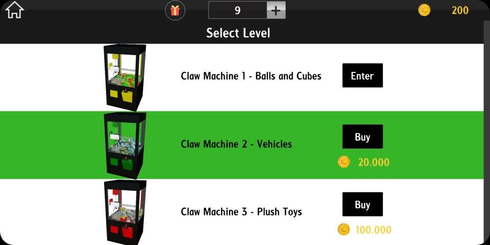 Collect coins to unlock new claw machines, helping objects in the shop and more. Every Object to claw has its own physics and a variation of difficulty to grab it. There are free coins and tries everyday. This app will continously updated. In future release you get a highscore and you can be the #1 in the leaderboard and much more.