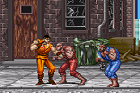Your character moves with the control pad, and can either attack with melee punches/kicks, or jump. Jumping combined with the attack button (while mid-air) causes for a jump attack. Pressing both buttons at the same time performs the character's special move. A character's special move eats up a small portion of the life bar, but instantly knocks down all surrounding opponents. Useful for getting out of sticky situations. Grapple attacks require you to move in close, but once an opponent is grabbed, you can then slam them to the ground knocking down other enemies.