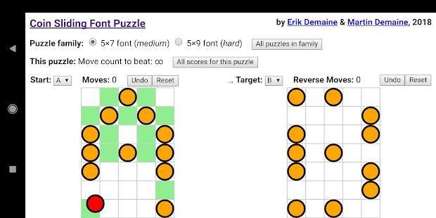 2664 font yang teka-teki koin-geser! teka-teki ini didasarkan pada dua font, masing-masing dengan 37 karakter (huruf, angka, dan garis miring). Untuk setiap pasangan karakter (katakanlah, A dan B), tujuannya adalah untuk menata kembali karakter pertama (A) ke dalam kedua (B) oleh urutan bergerak. Masing-masing bergerak mengambil satu koin dan menempatkannya dalam sebuah sel grid kosong yang berdekatan dengan setidaknya dua koin lainnya ( “2-adjacency” aturan). Selain memecahkan teka-teki, tujuannya adalah untuk meminimalkan jumlah bergerak.