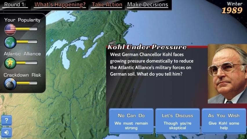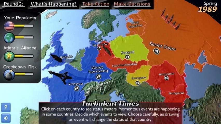 Tahun ini 1989. Anda Presiden Amerika Serikat dalam mengubah kali. Setelah empat puluh tahun penindasan, orang-orang Eropa Timur yang berani menentang penguasa komunis mereka di rumah dan di Uni Soviet. Dan sebagai Presiden, Anda juga menghadapi keputusan berani: seberapa jauh Anda akan pergi untuk mendorong reformasi demokrasi? Berapa banyak Anda akan risiko tindakan keras Soviet pada ini orang-kebebasan mencari? Akan membantu usaha Anda membawa demokrasi ke Eropa Timur, atau akan Anda memprovokasi Uni Soviet untuk menurunkan murka, menetapkan penyebab kebebasan kembali oleh beberapa dekade?