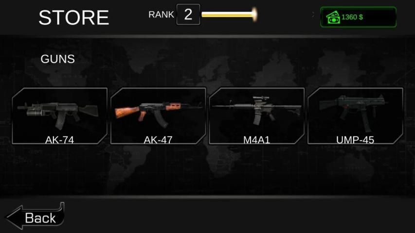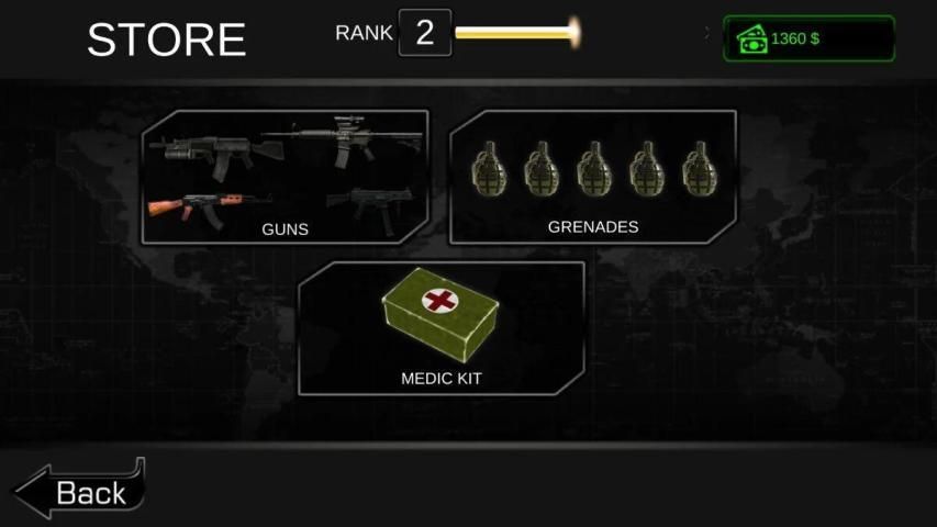 Untuk mempersiapkan diri untuk pertempuran adalah setengah kemenangan sehingga mengumpulkan koin dengan menyelesaikan misi dan membeli senjata untuk misi mematikan. Anda berbagai senjata untuk membeli dari toko seperti Sniper, RPG, M16, MG42, AK47, Grenade dan pisau.
