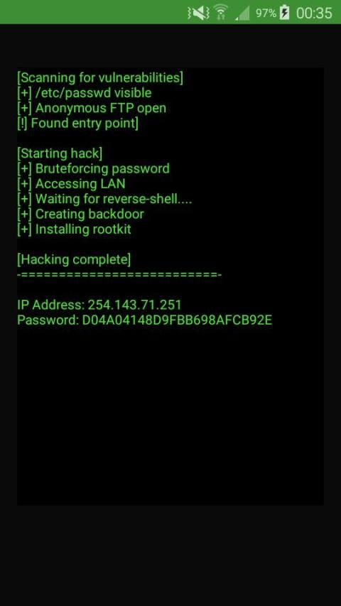 Simply open the app and select a target to hack, the rest will automatically be shown to you and make you look like you are hacking a computer as you will be given an IP address and password (these are both randomly generated IP addresses and passwords).