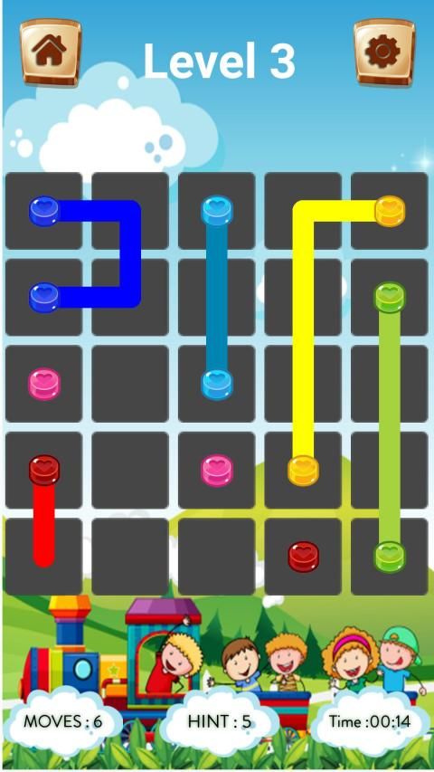 The game presents Number link puzzles: each puzzle has a grid of squares with colored dots occupying some of the squares. The objective is to Connect Candy Dots of the same color by drawing 'pipes' between them such that the entire grid is occupied by pipes. However, pipes may not intersect. Difficulty is determined by the size of the grid.