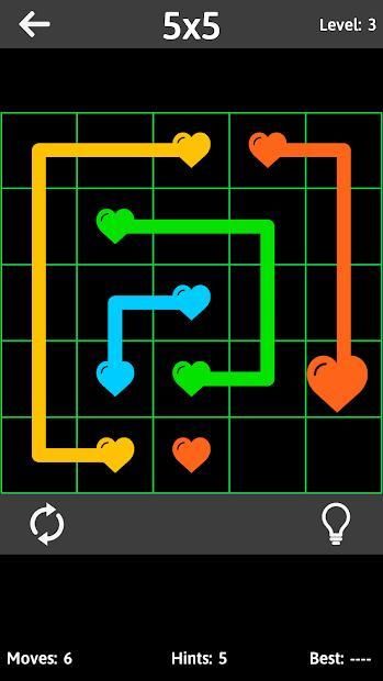 Connect matching colors with pipe to create a link. Pair all colors, and cover the entire board to solve each puzzle in Connect The Hearts. But watch out, pipes will break if they cross or overlap!