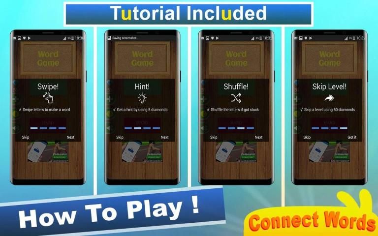 Playing Connect The Words - Game Kata Terbaik sangat mudah dan intuitif, layarnya sangat ramah pengguna dan menarik bagi pemain untuk kecanduan permainan kata-kata kereta otak ini. Huruf berada dalam lingkaran dan ditempatkan secara acak di sekitar, pengocokan dapat membuat posisi mereka berubah yang dapat membantu menghubungkan kata-kata, cukup gesekkan jari Anda pada lingkaran dan hubungkan huruf untuk membuat kata, pada penyelesaian level, level berikutnya dari otak akan membingungkan permainan pikiran terungkap.