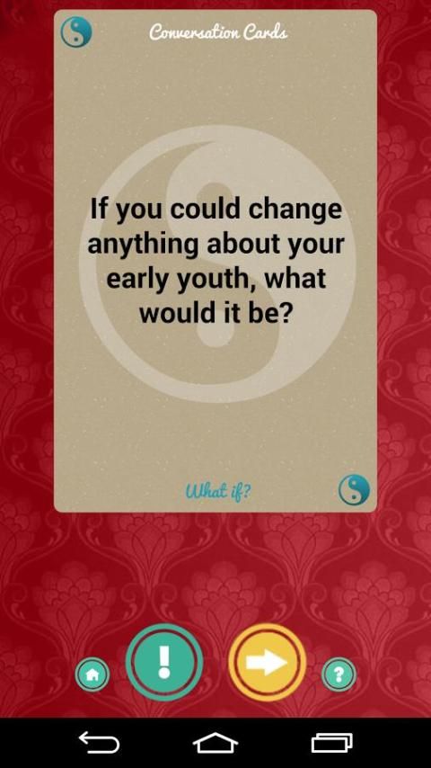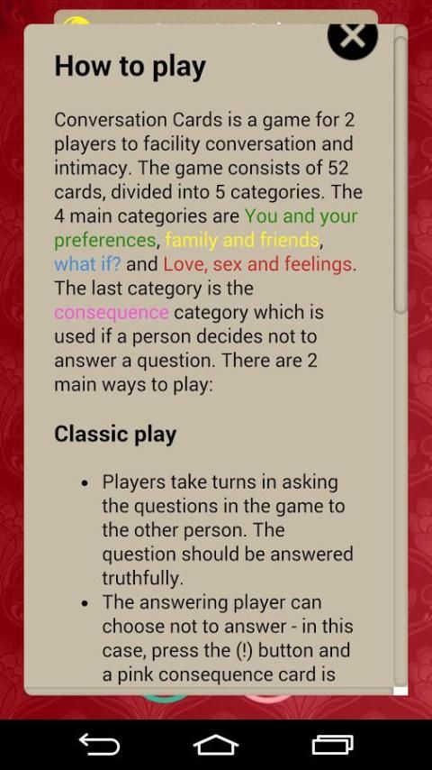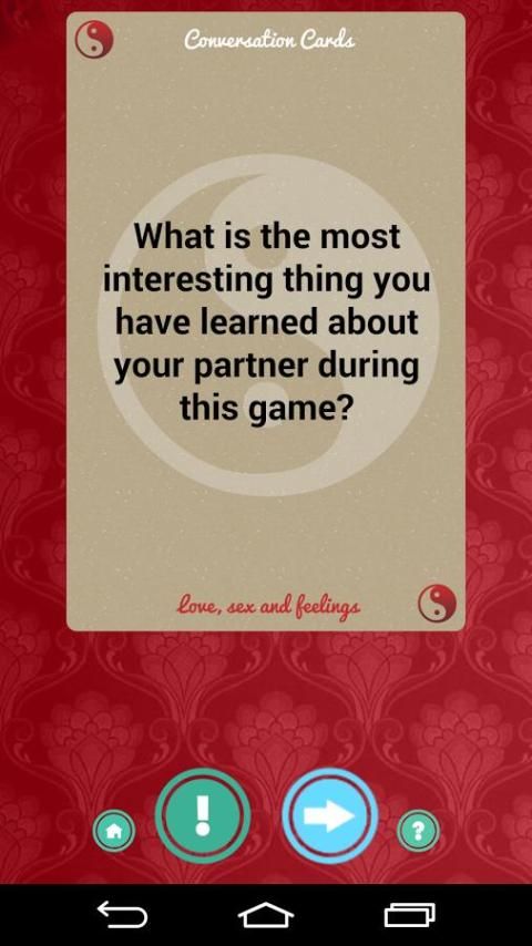 Anda dapat belajar banyak tentang pasangan Anda, teman, tanggal atau diri Anda sendiri dengan Kartu Conversation. Ini akan mengungkapkan hal-hal tentang diri Anda dan orang yang Anda bermain dengan. Sangat menyenangkan, inspiratif, bijaksana, tapi mungkin juga sedikit frightning. Apakah Anda siap untuk tantangan?
