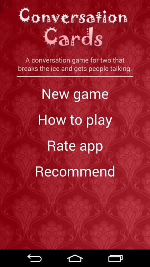 The game is played by two people who take turns in asking questions from a deck of cards in the game. Conversation cards are useful for dates, for friends, for getting to know your partner or for ice-breaking games.