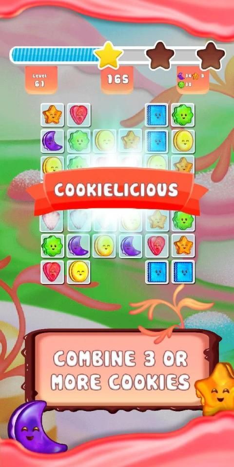 Tukar cookie dengan membuat baris minimal 3 untuk menghilangkannya dan memenuhi misi, buat cookie khusus dengan kombinasi baru untuk mendapatkan poin yang akan membantu Anda mengatasi level.