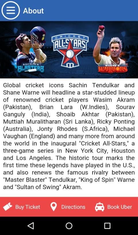 Cricket All Stars 2015 Event App provides details about the Cricket All-Stars 2015 cricket event happening in Houston, New York and Los Angeles.