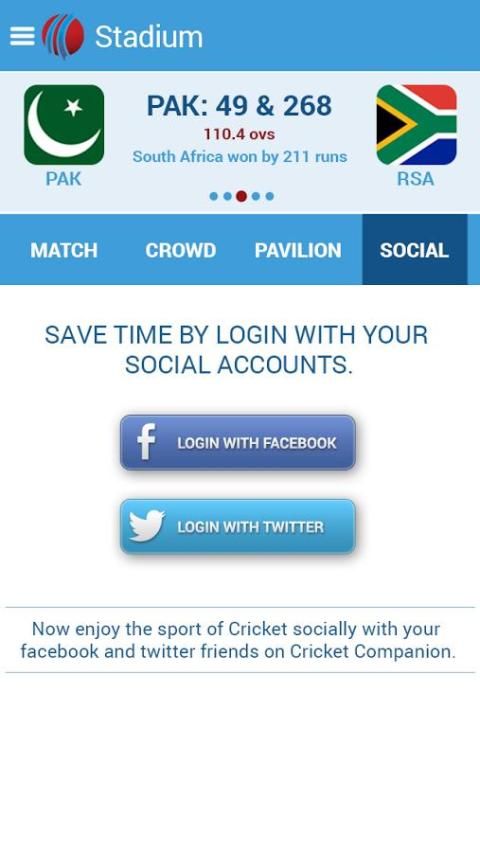 Cricket Companion Social, the first choice for live Cricket scores & features like live chat, commentary, comments, social media connectivity and much more. Invite your friends to your virtual stadium, shout, clap, dance and laugh with other cricket lovers anytime, anywhere and never miss a single moment of fun. Share pictures, videos, files etc. with your friends. Stay connected with facebook, twitter from within the app. Catch live ball by ball cricket scores of upcoming world cup and stay updated