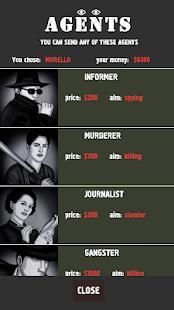 Use different tricks and opportunities you have. Send agents to enemies, put them in jail or eliminate them. Participate in congress elections, do smuggle, hire bodyguards and make money in business. Learn about advantages and disadvantages of every family to make yourself invincible.