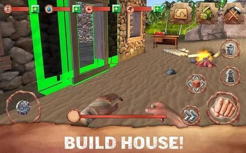 Collect items, get different resources, cut down palms, build own house in new survival game.