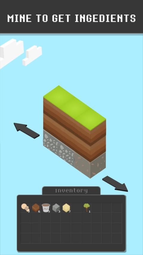 Mine cubes of dirt, sand, stone and a lot more to gain ingredients which you can use in the fusion part of the game later, or you can create buildings with them. Tap the cube blocks to mine them. Some of the cube blocks will take longer to break. To make your life easier, you can craft tools like a pickaxe or a shovel. These tools will help you mine cube blocks faster. It's really simple and fun!