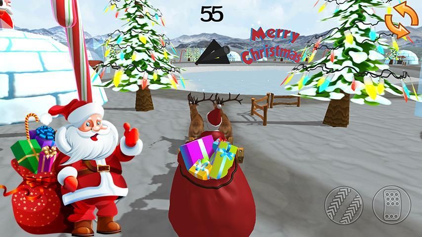 Santa Claus menunggu di depan 4 magic rusa dan giring naik ke siap. Bagian yang menarik dari permainan Santa Claus sepenuhnya mengendalikan kemudi mobil ini pedal gas dan rem seperti mobil!