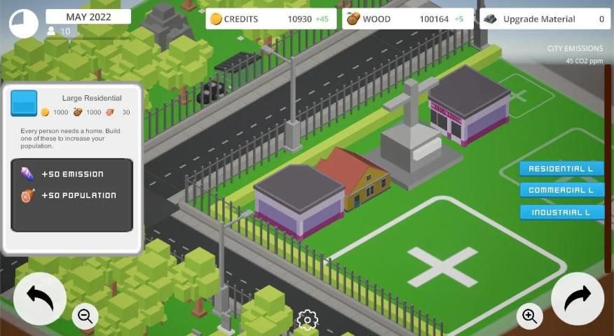 Game ini adalah pembangun kota dasar dengan fokus ramah lingkungan. Tempatkan bangunan untuk meningkatkan generasi sumber daya. Tingkatkan bangunan untuk mengurangi emisi. Cobalah untuk mencapai persyaratan populasi sebelum 2040 sambil menjaga emisi Anda di bawah batas.