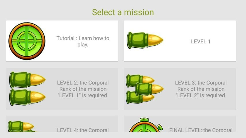 Pemain harus menembak semua musuh dengan senjata dan menyelesaikan semua misi bernama Level 1 hingga 4 dan mencapai ke tingkat akhir.