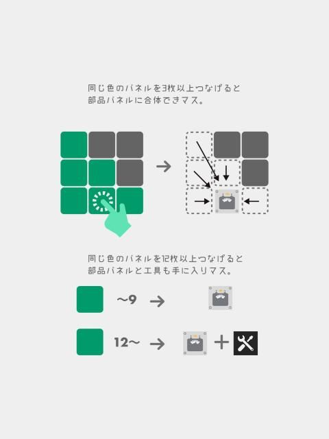 ・同じ色の通常パネルを3マス以上つなげると歯車が回転し始めます。