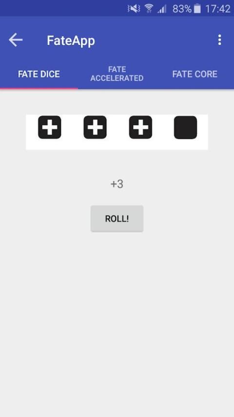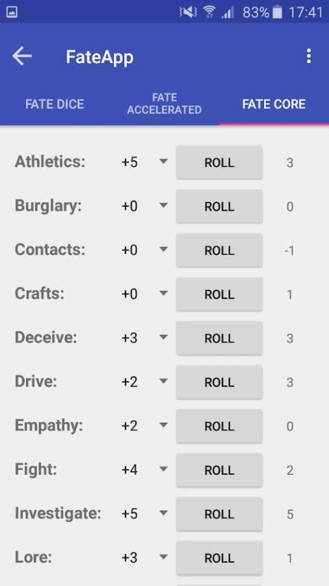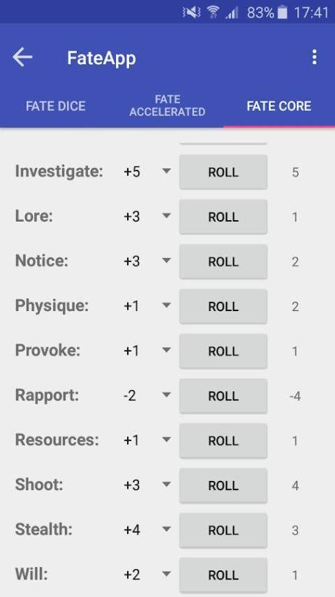 Dadu, keterampilan dan pendekatan rol aplikasi untuk digunakan dengan Fate Core dan Takdir Accelerated pena dan kertas pengaturan RPG. Aplikasi ini adalah gratis untuk digunakan dan tidak mengandung menambahkan. NASIB adalah merek dagang of Evil Hat Productions, LLC.