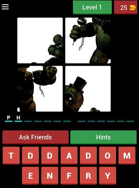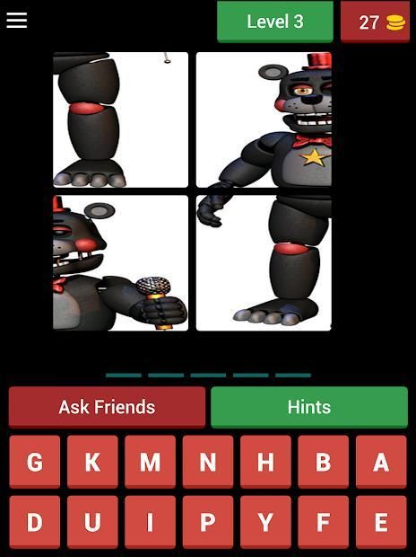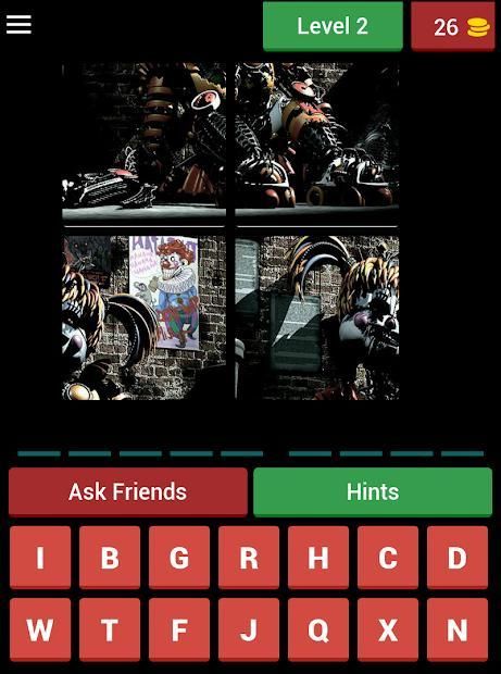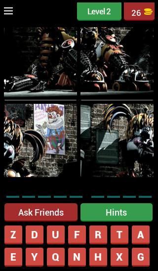 FNAF - 4 Pic 1Word adalah gim di mana Anda harus melihat 4 gambar dan menebak nama karakter populer dari FNAF!