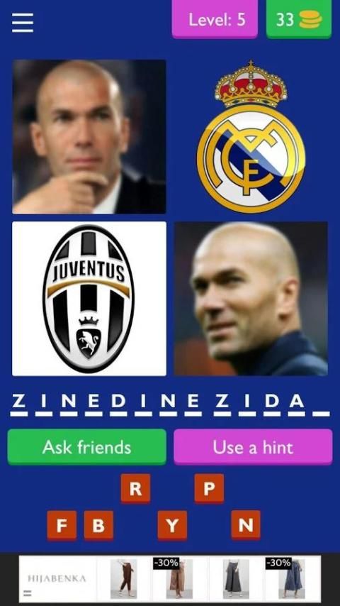 4 Pics 1 Football Player dengan menggunakan 4 gambar sebagai petunjuk bagi Anda untuk menebak nama pemain sepak bola. Anda harus menjawab pertanyaan untuk melewati setiap tingkat dengan menempatkan huruf yang tepat pada ruang yang tersedia yang merupakan nama pemain football.