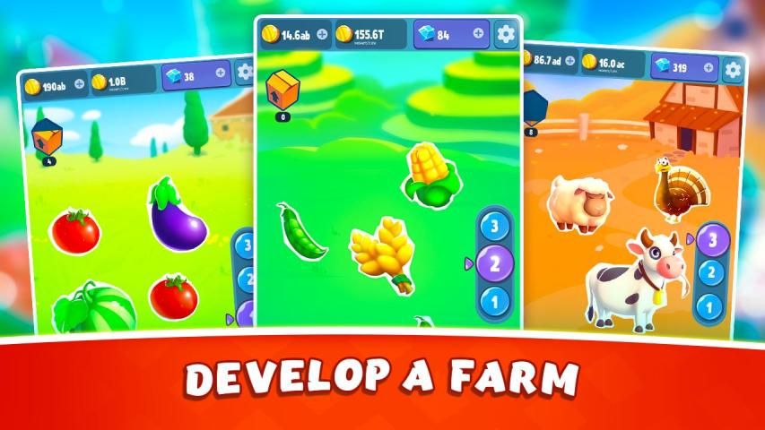 In this farm game you start from growing some vegetables like tomato, eggplant or pumpkin. Merge your crop to open new kinds of vegetables and evolve. Develop your fields to grow cereals and corn. Get animals: chickens, pigs and cows, to make your farm more profitable.