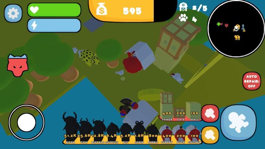 You will survive on the island, hiding from fierce wild animals. Build walls, gates, towers and upgrade these constructions to protect your farm. Build barns to earn gold.