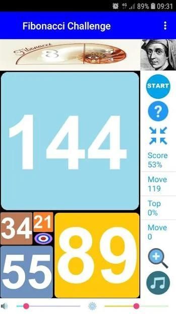 The objective of the game is to construct 7 successive Fibonacci square tiling by colliding consecutives Fibonacci square numbers (F1=1, F2=1, F3=2, F4=3, F5=5, F6=8, F7=13, F8=21, F9=34, F10=55, F11=89, F12=144). Each Square tiling is formed by 5 of consecutive Fibonacci squares plus an origin to design previous Fibonacci numbers. The 7 successive Fibonacci square tiling allow to progress in the Fibonacci sequence until the Fibonacci number 144.