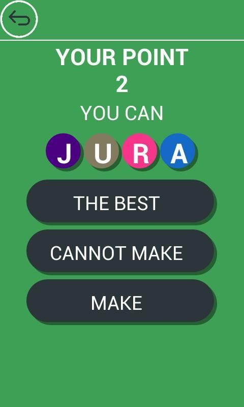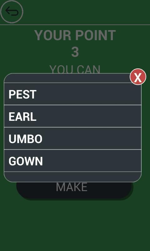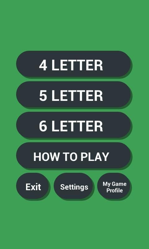 Empat menu, klik salah satu dari pilihan lima atau enam huruf, lalu klik huruf menggunakan semua huruf pada layar untuk mencoba untuk membuat sebuah kata yang bermakna. Pendapatan kata yang tersedia untuk secara otomatis menyaring surat baru untuk kata berikutnya.