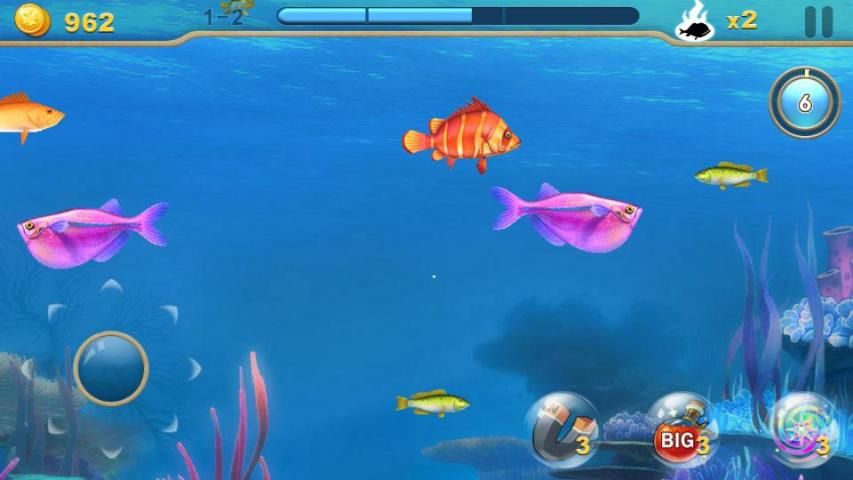 The play is very simple, that eat smaller fish than yourself so that you grow up as quickly as possible,it becomes more and more powerful, can eat more different kinds and sizes of fish. when reached scores,you can pass and enter the next level.