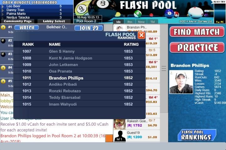 Tantang teman Anda di Game Pool Online terbaik. 8-bola, 9-bola dan jenis permainan lainnya, Peringkat, run-out dan statistik lainnya, sistem obrolan Lobby. Hingga 64 pemain di meja. Fisika yang realistis dan pemodelan yang akurat. Permainan yang menyenangkan dan cepat.