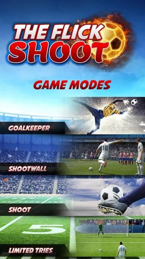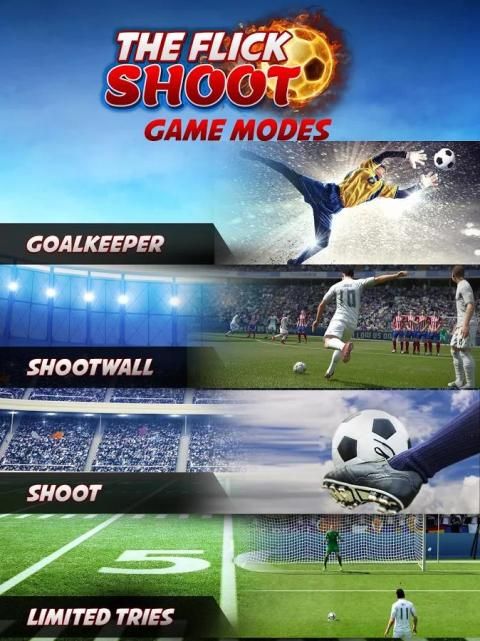 Flick Sepakbola Tembak Tantangan memiliki berbagai mode, Shoot (Goal Against AI), Goal penjaga Mode (Simpan Gratis Kicks), Tembak dinding (Goal melawan AI dan Simpan melawan AI) dan menembak tantangan (Terbatas Mencoba untuk menyelesaikan Sasaran Target)
