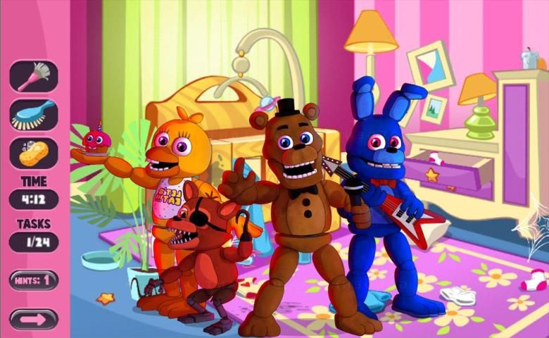 This Fnaf room cleaning game is also a memory game - remember where each scattered object should go! Placing toys in the nursery in order, arranging all plates and utensils in the kitchen and so on ..