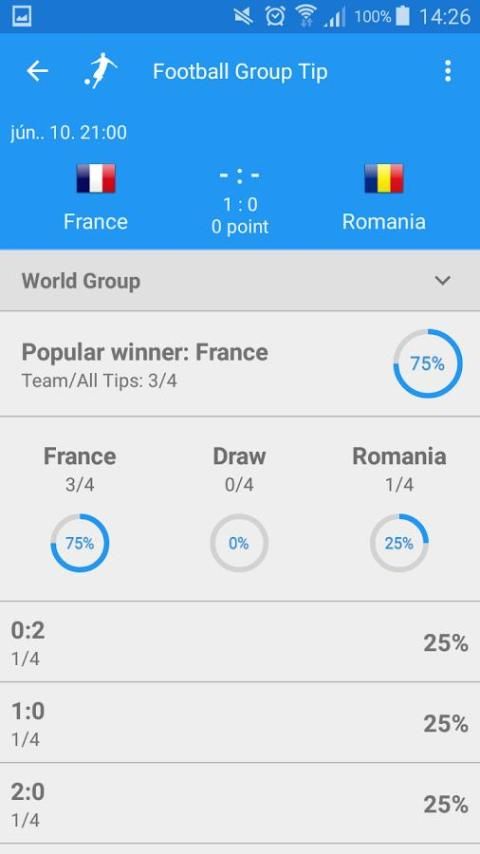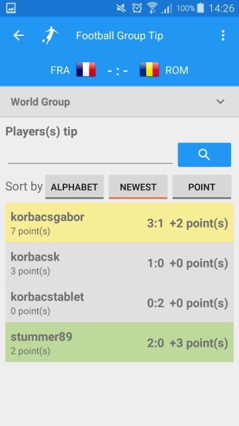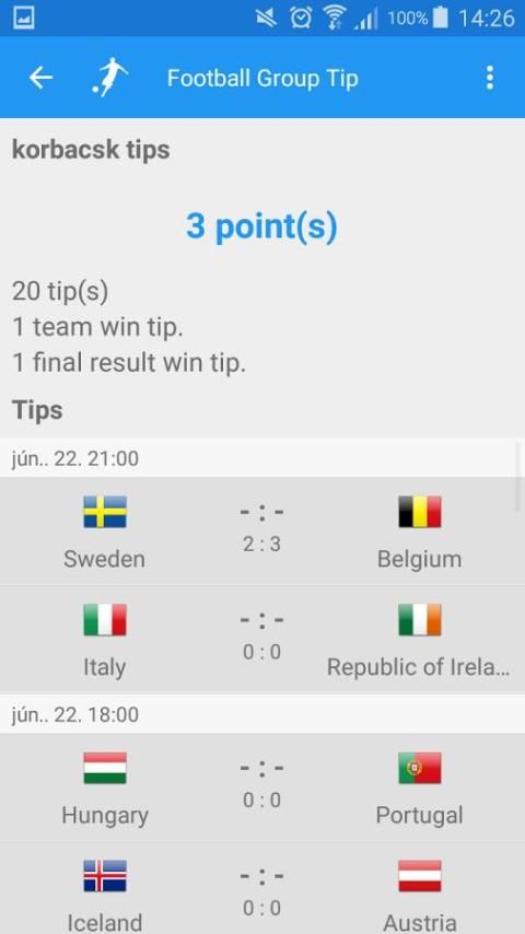 Tip hasil pertandingan di Euro 2016 dan mendapatkan poin (tim hit: 2 poin, hasil yang hit: 3 poin)