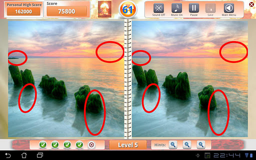 Top photo hunt, spot differences find differences game for the honeycomb tablets.Specially developed for the Honeycomb tablets, it is the best spotthedifference game for the Android.Hunt and find five differences between the two photos before the time runs out.Foto Fun is available in three modes.If Beach is easy strolling for you, try the Challenge mode.Or see how long you can last in Explosive mode.Please note this game works for tablets with resolution 1024x600 and higher i.e., works with 1024x600, 1024x768, 1280x768 and 1280x800.Features: 75 high resolution HD pictures with 50 levels. 3 difficulty modes: Beach, Challenge, and Explosive 3 hints for each level Pause game at any time Save game option every 3 levels Personal and Global scoreboardCompete with the worlds best for the top rank on the Global scoreboard...and have funAs we cannot test against all tablets, please let us know if the graphics do not work with you tablet.You can reach us at support@appyfun.com.Also, please email us if you have any suggestions for improving the game.Thanks.